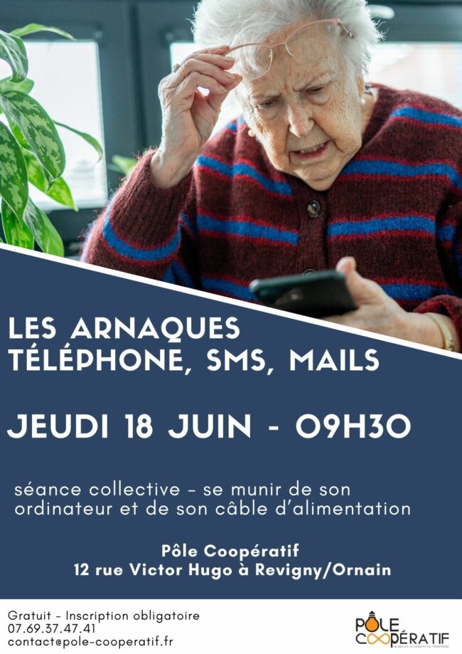 Nous vous proposons plusieurs ateliers collectifs numériques, ouverts à toutes et tous, pour gagner en autonomie dans le numérique et échanger dans une ambiance chaleureuse. Ateliers animés par Gilles jusqu’à l’été, de 09h30 à 11h30 les jeudis suivants : 18/06/2026 Les arnaques téléphone, mails, sms Inscription conseillée au 07.69.37.47.41