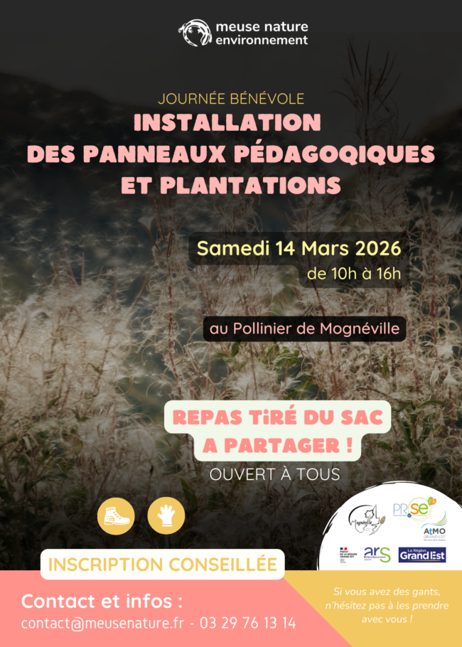 RDV au Pollinier de Mognéville (sortie du village en direction de Revigny) Inscription conseillée à contact@meusenature.fr ou au 03 29 76 13 14. JOURNÉE OUVERTE À TOUS Nous avons besoin de votre aide pour installer des panneaux pédagogiques et planter de nouvelles espèces sur le site ! Pour le déjeuner, le repas est tiré du…