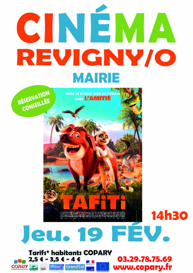 CINÉMA en COPARY LE JEUDI 19 FÉVRIER 2026 A LA MAIRIE DE REVIGNY/O à 14h30 Tafiti Animation, Aventure, Famille | 1h 20min | (tous publics) De Nina Wels | Par Nicholas Hause, Julia Boehme Avec Cosima Henman, Bürger Lars Dietrich, Thomas Schmuckert L’histoire : Lorsque Tafiti, un jeune suricate, rencontre Mèchefol, un cochon sauvage aussi sympathique…