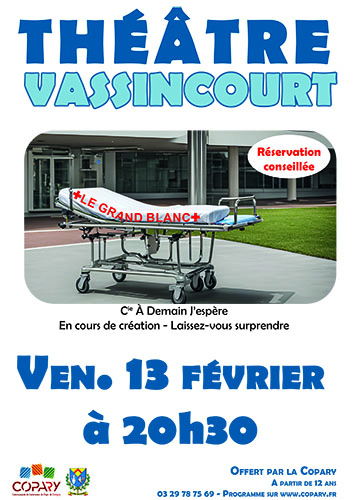 « Les rendez-vous culturels des 16 », en COPARY Vendredi 13 Février 2026 à 20h30 Salle des fêtes de Vassincourt “ Le Grand Blanc ” Cie A demain J’espère (Besançon) Théâtre – tout public, à partir de 12 ans Cette Compagnie est déjà venue sur le territoire (Andernay, en novembre 2022) avec le spectacle « ObsolèteS ». Elle…