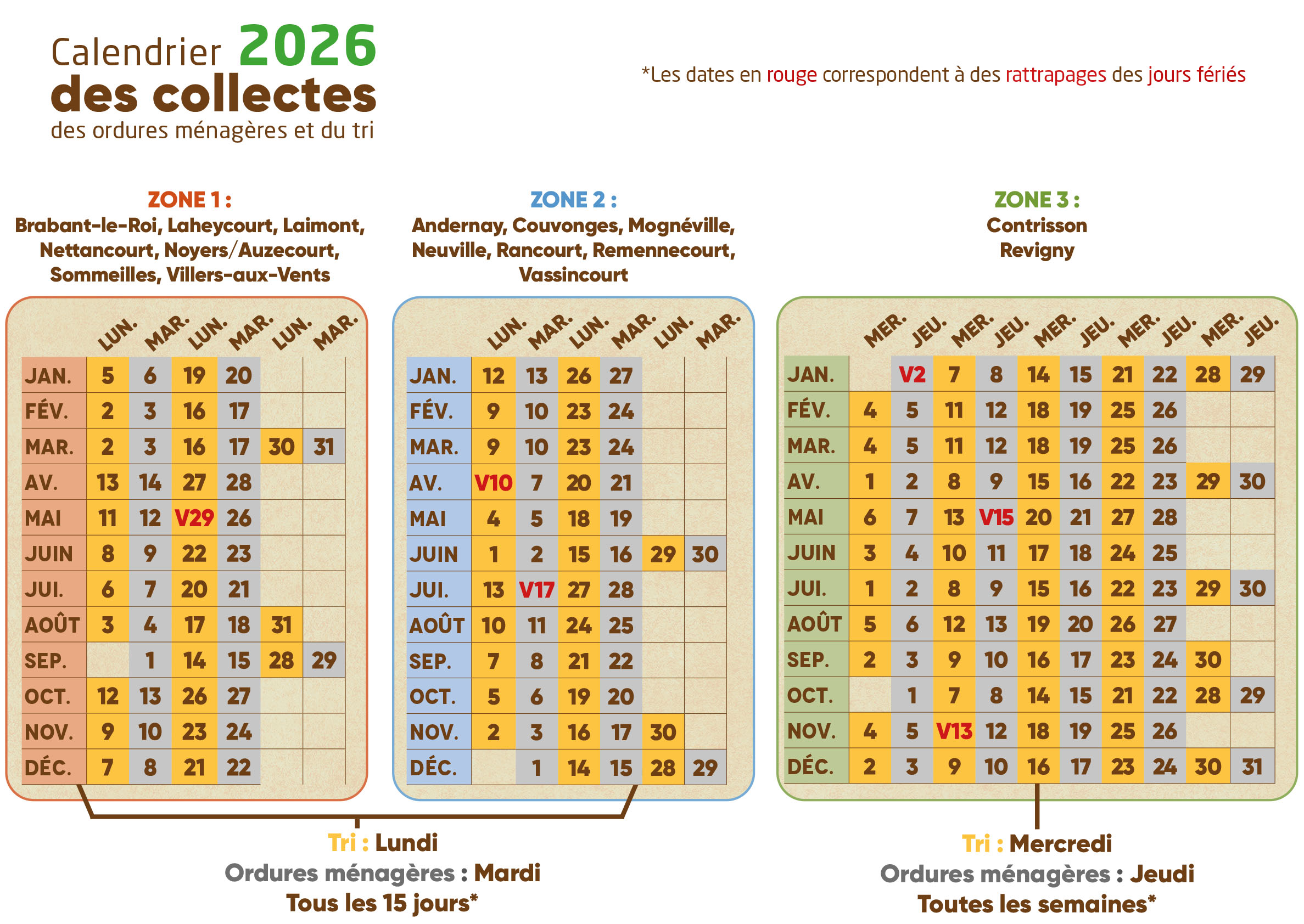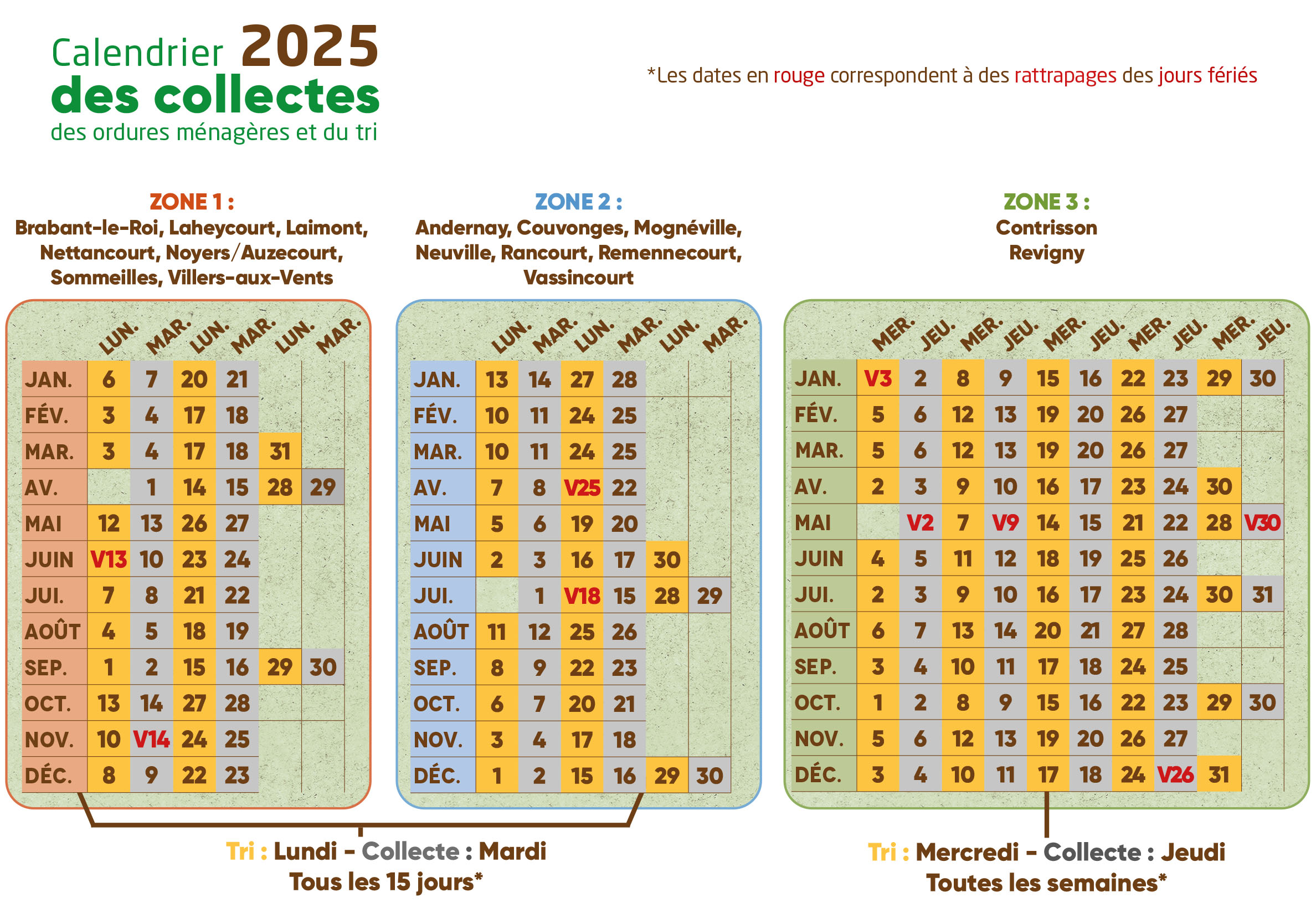 La collecte des ordures ménagères et du tri sélectif en 2025 se déroulera selon le calendrier suivant :